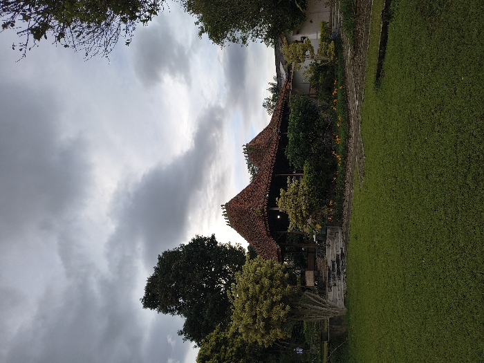 The scene depicts an outdoor view in the city of Unknown, Vietnam, under an overcast sky. In the mid-ground, a traditional-style building features two prominent, multi-tiered roofs constructed from reddish-brown, scalloped tiles with distinctly upturned eaves. Small, dark ornamental figures are visible along the main roof's ridge. The building's interior is illuminated, indicating an open-sided design or large windows. A series of grey stone steps ascends from a manicured green lawn in the foreground towards the building. The immediate vicinity of the structure is landscaped with dense green and yellow-green shrubs, various foliage, and garden beds containing orange-colored flowers. A tall, dense dark-green tree is prominent in the upper left background. On the far left, a lone individual wearing light-colored clothing stands on an elevated paved surface. A segment of a white-colored building is discernible on the far right, partially obscured by trees.