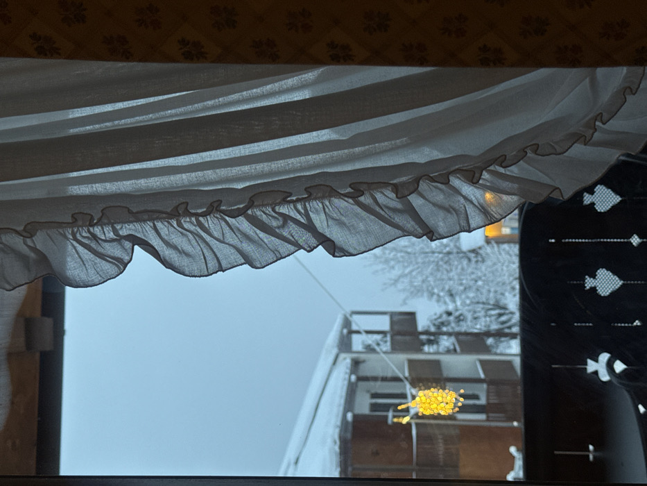 window framed by a ruffled white curtain. Outside, a black and white scene includes a building with a curved roof, possibly a windmill. Bare trees are visible in the background. A string with small, bright, yellow lights hangs in front of the building, creating a blurred effect. A dark decorative screen with fish-shaped cutouts is partially visible on the right side of the window frame.