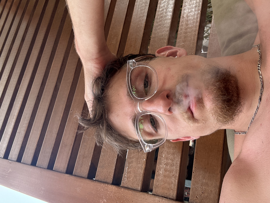 A close-up, upward-angle portrait depicts a male individual with light skin, disheveled brown hair, clear-framed eyeglasses, a mustache, and a goatee. He is bare-chested, wearing a silver-colored chain necklace, and exhaling a visible plume of smoke from his mouth. His right hand is positioned with fingers resting lightly on his hair above his forehead. Reflections of green foliage are present in his eyeglass lenses. The background consists of a brown wooden slatted structure, suggestive of outdoor furniture or paneling, with a light-colored fabric or cushion partially visible to the lower right. The scene is located in Calangute, India.