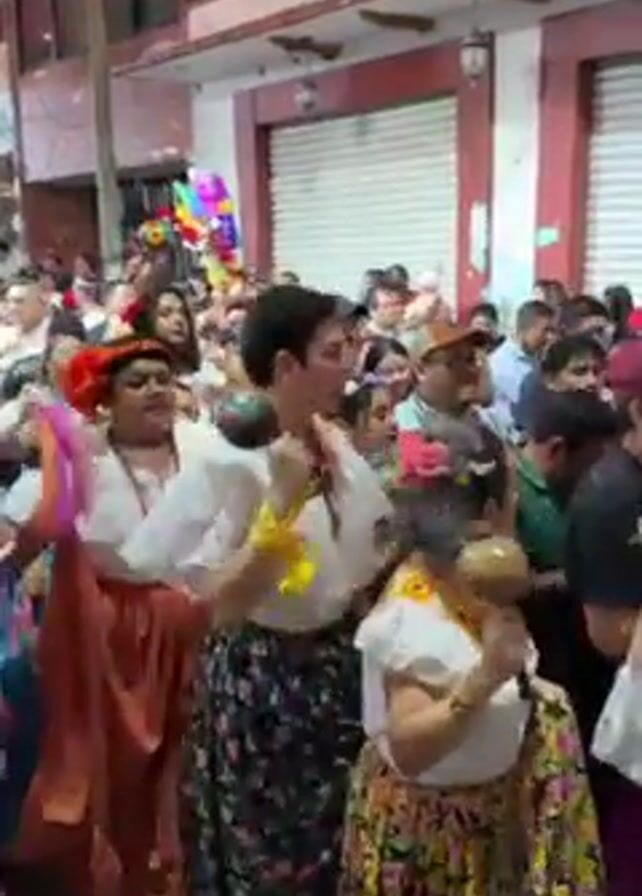 A lively street parade is in progress, filled with people celebrating under colorful overhead decorations. The participants are dressed in a mix of casual and traditional clothing, with several women wearing floral skirts, white blouses, and flower headpieces. They're holding maracas and other objects, shaking and dancing along to the music, though the source isn't visible. The crowd includes a diverse group of people, many smiling and appearing to be engaged in the festivities. Buildings line the street, some with closed shutters. The overall atmosphere is cheerful and celebratory.