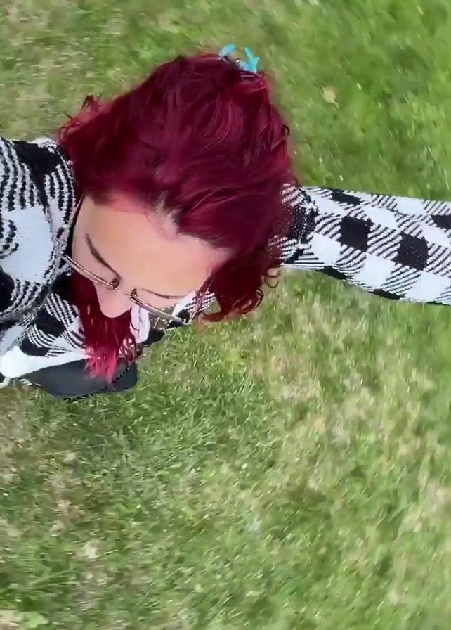 A young woman with red-dyed hair, wearing glasses and a black and white patterned sweater, is standing in a grassy field