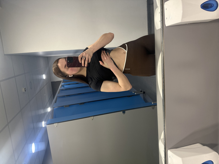 A young adult female is depicted in a mirror selfie taken within what appears to be a public restroom or changing room, a common facility found in cities such as Dundee, United Kingdom