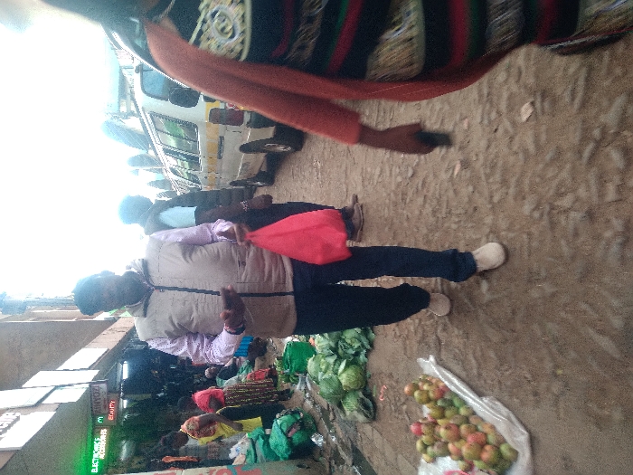 A street scene depicts people and produce. A man in a vest holds a red bag and looks at stalls of green vegetables. Another person walks by, holding a phone. Various fruits and produce are displayed in bags. A white van is partially visible in the background. The overall atmosphere is bustling with activity.