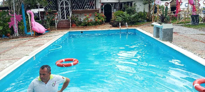 A rectangular pool is surrounded by brick and stone. A white house is in the background. A man stands in the pool, and two orange life preservers float in the water. A pink flamingo decoration stands near the pool, and plants and decorations surround the area. The pool water is light blue.