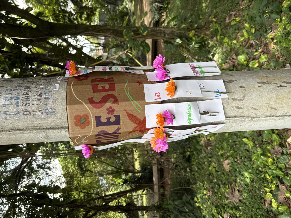 A concrete utility pole, located in a vegetated area of Cali, Colombia, stands as the central subject. The middle section of the pole is wrapped with a hexagonal cardboard structure, hand-decorated with orange and red flower motifs and the words "FIORE SER" in purple and red letters. Below this cardboard, multiple white paper strips are stapled to the pole, forming small open pockets. Each pocket holds one or more small flowers, predominantly pink and orange chrysanthemums. Several paper strips display handwritten Spanish words such as "Luz" (Light), "agradecer" (to thank), "Siempre gracias" (Always thanks), and "Hoy" (Today). The upper portion of the pole exhibits faded, layered markings and numbers, consistent with utility identification or graffiti. The surrounding environment features lush green foliage, large trees, and undergrowth covering the ground, illuminated by bright daylight. No individuals are present in the scene.