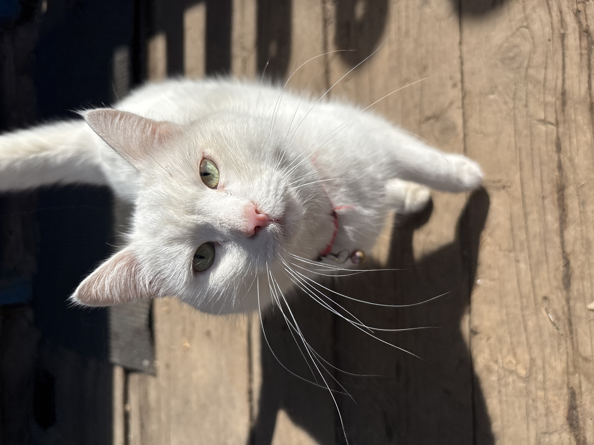 A close-up, high-angle shot captures a white cat on a wooden surface. The cat, with light green eyes and a pink nose, gazes upwards. It wears a red collar with a small bell. Sunlight casts shadows from an unseen structure above, creating contrasting light and dark areas on the wooden planks. The location, Osa, Russia is not deducible from visual elements.