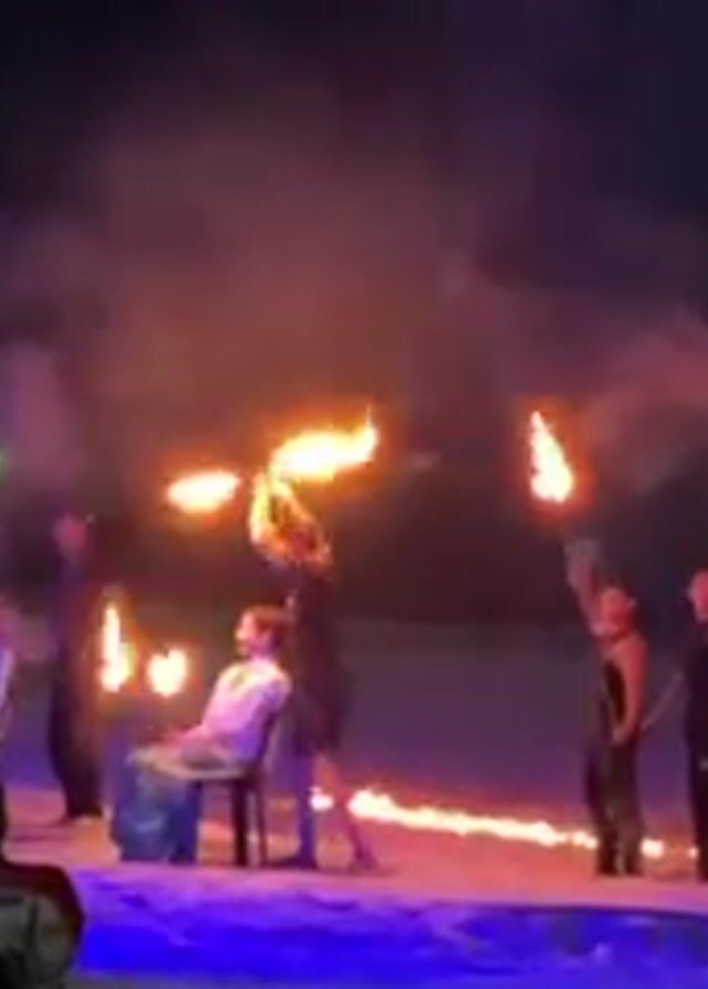 nighttime fire performance taking place on a beach. Several performers, mostly in dark clothing, are holding flaming torches and performing various movements around two people seated on chairs. The stage area is illuminated with blue and red lights. In the background, there's a body of water reflecting distant lights. There are also spectators watching the performance.