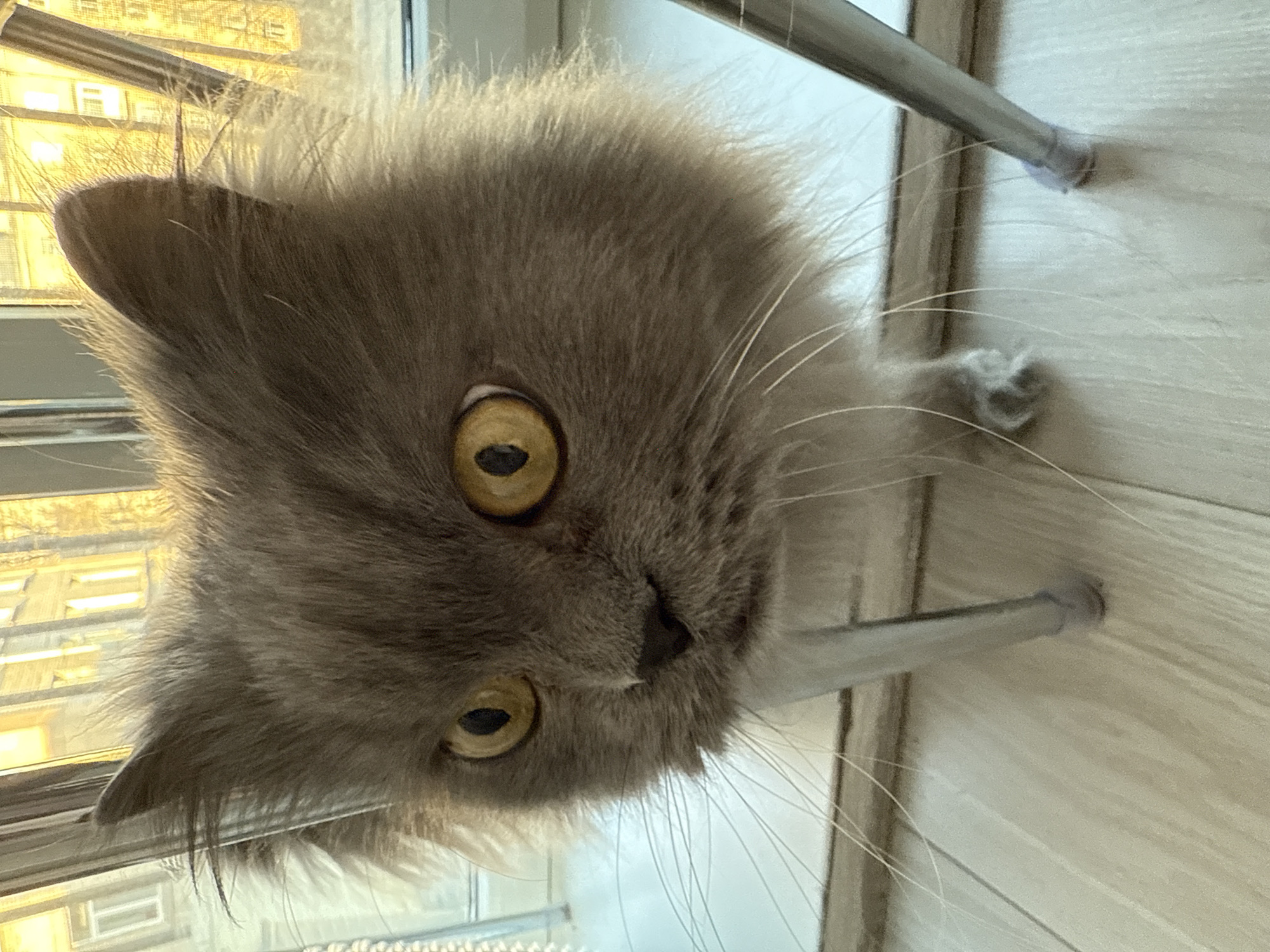 An image displays a grey, long-haired domestic cat with large, round amber eyes and prominent white whiskers, positioned low and looking directly forward. The cat's head dominates the foreground, partially obscuring its body. Its front paws are visible on a light-colored wooden floor. Two vertical, silver-colored metal legs, likely from a piece of furniture, flank the cat, with one leg featuring a light-colored rubber foot cap. Behind the cat, a window with a white frame is visible. Through the window, blurred multi-story buildings with numerous windows are apparent, illuminated by a warm, golden sunlight. The scene is set indoors in the city of Saint Petersburg, Russia.