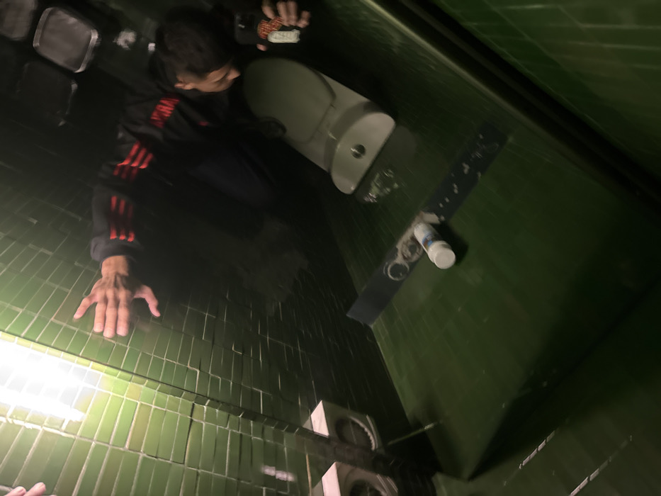 This image depicts the interior of a tiled room, likely a restroom, within Mexico City, Mexico. The walls and floor are covered with dark green, rectangular, glossy tiles arranged in a stacked pattern. A bright, vertical fluorescent light fixture is visible on the upper left wall, illuminating the scene. On the right, a white, wall-mounted toilet with a closed lid is affixed to the tiled wall. Below the light on the left wall, two white circular ventilation grilles are visible. In the foreground, on a dark, flat surface, a white pill bottle with a blue label lies on its side, alongside two small metallic rings and several water droplets. A sole individual, wearing a dark jacket with red stripes on the sleeves, is captured in what appears to be a mirror reflection. Their right hand is pressed against the tiled wall. The individual's head is tilted downwards, directed towards the objects on the flat surface, while their left hand holds a smartphone, apparently capturing the reflection.