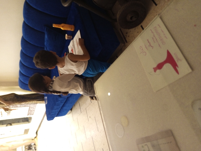 This image depicts an indoor scene within Rukn ad-Din Municipality, Syria. Two young children are shown from behind, kneeling on a light-colored tiled floor adjacent to a royal blue tufted sofa. The child on the left, with dark hair in a braid, wears a white long-sleeved shirt and gray pants. The child on the right, with dark, short hair, wears a white sleeveless top and blue shorts. Both are facing the sofa, engaged with a white sheet of paper, likely a coloring book, placed on the cushion. An orange bottle and a small white cup rest on the sofa to the right of the children. In the foreground, a light-colored table displays two white circular objects, a rectangular item with a smiley face graphic, and a white business card. The card features a pink dress silhouette logo and Arabic text including "حنان جمالي" (Hanan Jamali, suggesting "Hanan's Beauty/Salon") and a phone number. In the background, near a brightly lit doorway, a mannequin dressed in a patterned long gown is partially visible. A dark object, possibly part of a stroller or utility cart, is visible on the far right.