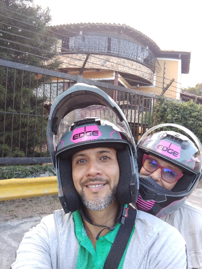 Two people wearing helmets marked with “EDGE” are visible. The person in the front has a wide smile, displaying their teeth, and is wearing a green shirt under a gray jacket. The individual behind them is wearing pink glasses and is partially obscured by the helmet. A black metal fence and a distinctive multi-story house with a round balcony and stone accents can be seen in the background. The setting appears to be outdoors, possibly on a street.