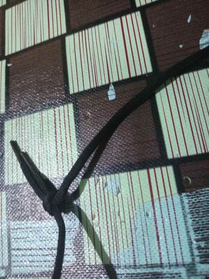 The image presents a close-up, angled view of a black, cord-like object, approximately 4-5 mm in width, secured with a visible knot. The cord is situated on a textured, patterned surface, likely a laminated plastic sheet or tablecloth. The surface pattern consists of a grid-like arrangement featuring light green rectangular sections with thin, vertical red stripes, interspersed with solid dark brown rectangular areas, all outlined by black borders. The surface exhibits signs of wear, including multiple small tears and lifted fragments of the top layer, appearing as light-colored, irregular specks, predominantly on the striped sections. No individuals, other subjects, or specific actions are depicted. The environment is indoors. The depicted scene is located in Bandung City, Indonesia.