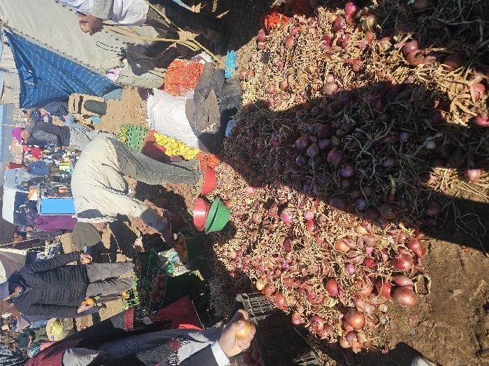 The image depicts an outdoor market scene in Azrou, Morocco, under bright daylight. In the immediate foreground, a vast quantity of red onions, still partially attached to their dried roots and foliage, lies directly on the bare earth, occupying the lower half of the frame. A long, dark shadow, likely cast by an observer, extends diagonally across this onion pile. To the far left, a person's hand, partially obscured by dark clothing with a white pattern, holds a single red onion. Two plastic bowls, one green and one red, rest on the ground amidst the onions. In the midground, a man wearing a light-colored jacket, dark trousers, and a dark beanie is bent over, actively reaching into a green plastic crate, possibly sorting or selecting produce. To his immediate right, a large white sack of produce, several net bags containing yellow citrus, and other bags filled with orange vegetables (possibly carrots or peppers) are arranged on the ground. Further right, a person in dark attire, mostly obscured, stands next to a market stall formed by a blue tarpaulin. To the left of the bending man, another man in a dark jacket, dark pants, and a dark cap stands upright, observing the scene. Green crates filled with what appear to be oranges or similar round fruits are positioned near him. The background reveals a bustling market environment with numerous individuals moving between stalls. Market tents and tarpaulins, including a beige-colored one, are visible. A white van and other vehicles are parked further back. In the far distance, hills or mountains rise under a clear sky, with scattered buildings featuring reddish roofs visible on the horizon. The scene is illuminated by strong sunlight, evidenced by the distinct shadows.