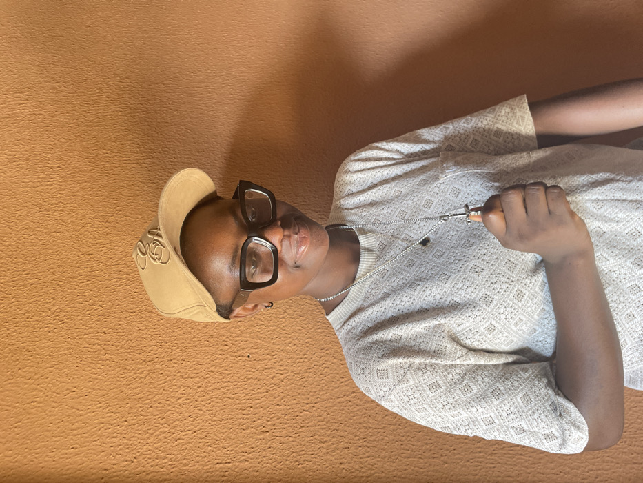 A young individual with dark skin is depicted from the upper torso upwards, positioned against a textured orange-brown wall in Ajara, Nigeria