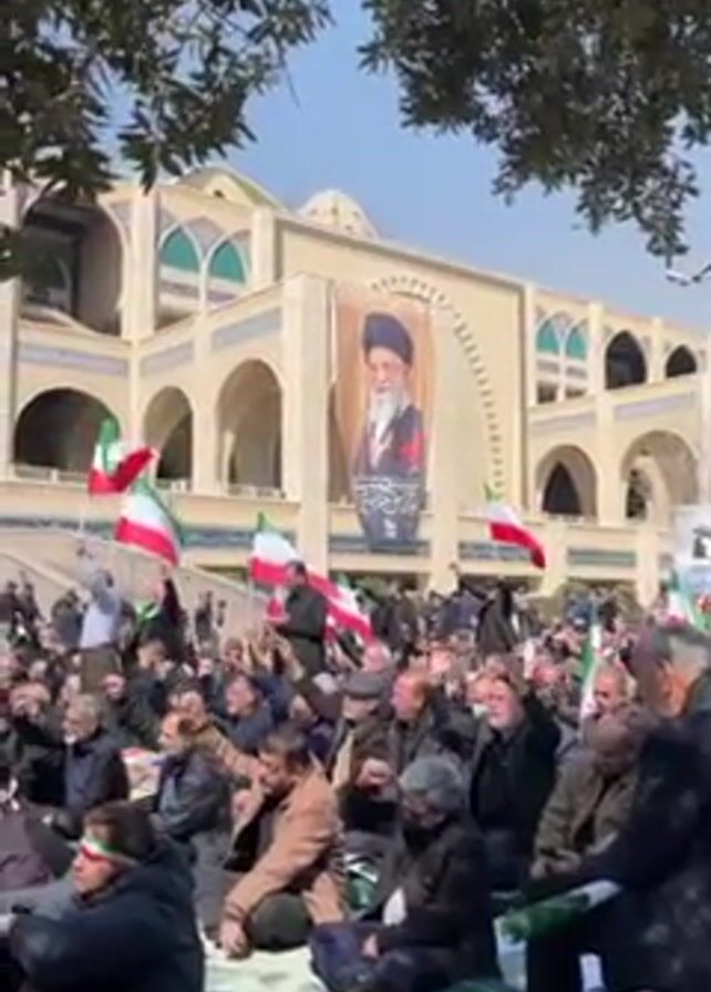crowd of people gathered in front of a building with a large portrait displayed on its facade. The portrait depicts a man in religious attire. Many people in the crowd are holding and waving Iranian flags. The crowd appears to be chanting or participating in a rally. The environment suggests an outdoor setting with some trees visible at the top of the frame. The building features architectural elements with arches and a dome, indicating a possible religious or governmental structure. The overall atmosphere suggests a political or religious gathering in Iran.