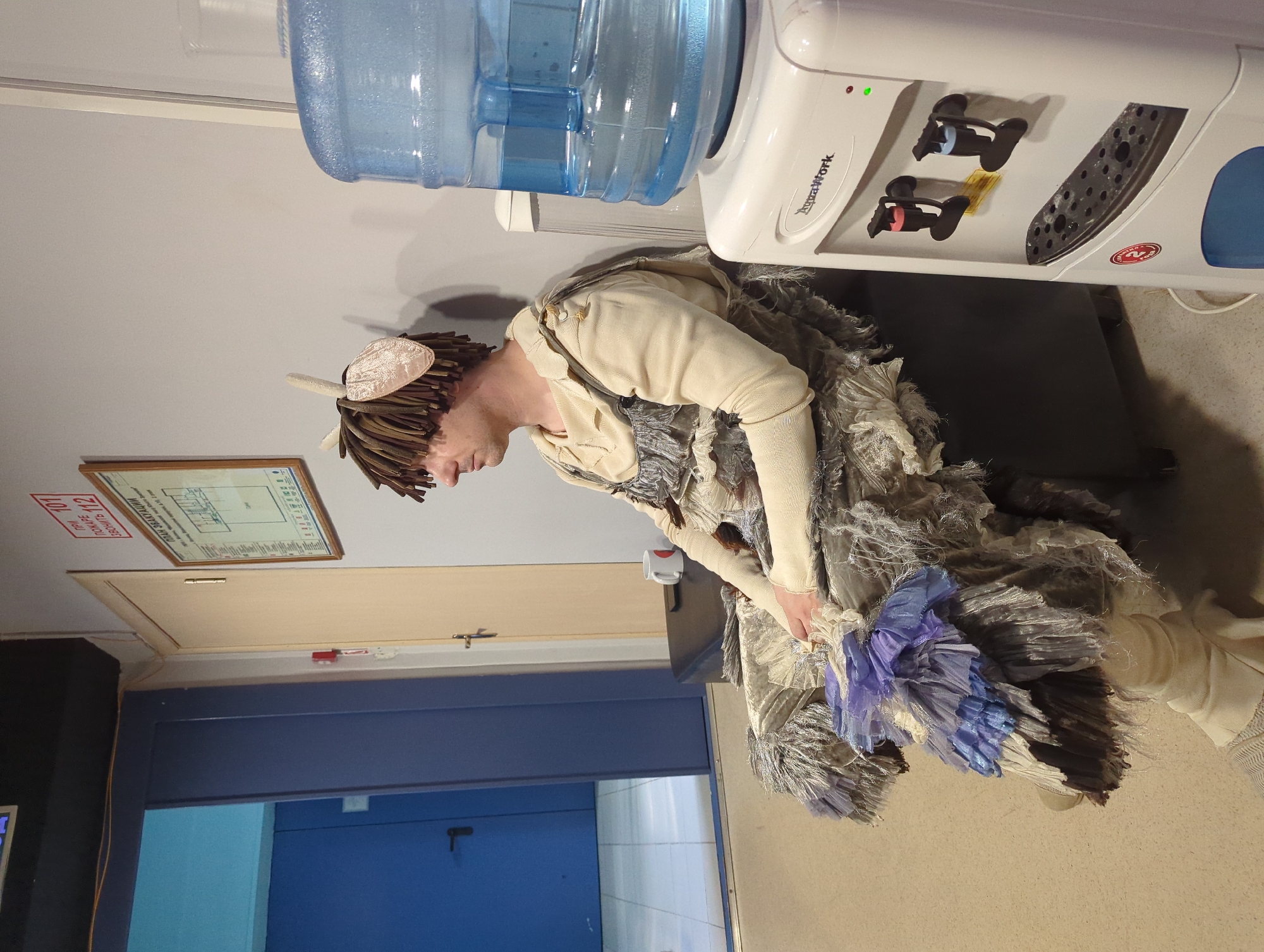 A person wearing a costume composed of layered gray and silver fabrics, topped with a straw-like headdress, is seated next to a water cooler labeled "AquaWork". The background includes a wall with a framed diagram, a door, and a portion of a blue wall with another door. The location appears to be an office or institutional setting. There is no indication of Moscow, Russia.