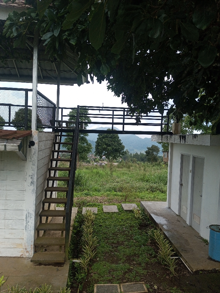 The image captures an outdoor scene in Abbireddygudem, India, viewed from beneath a canopy of dense, dark green tree leaves. In the left foreground, a weathered white building with horizontal siding supports a dark, unpainted metal external staircase ascending to an elevated platform. A dark, cylindrical fixture is mounted on the white building near the staircase. The elevated platform features a dark metal railing system visible against the sky. To the right, a separate white, single-story building presents two light-colored, vertically paneled doors, accessed by a concrete walkway. A blue barrel or drum rests on the ground to the right of this building. The central foreground consists of a grassy area interspersed with square concrete stepping stones, flanked by two parallel rows of slender, light-colored ornamental plants. Beyond the immediate structures and landscaping, the mid-ground is covered by an expanse of unkempt green vegetation, including tall grasses and trees, with a few distant structures visible. The background features a range of hazy mountains under an overcast sky. No individuals are present in the scene.