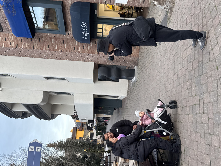 A photographer in a black outfit with a camera takes a photo of a family with a stroller. The family includes two adults and a child in the stroller, all warmly dressed. They're situated on a brick-paved street near a building with storefronts, including one named "Artful Sol." A blue awning, public restroom sign, and bare tree add to the winter ambiance of the scene.