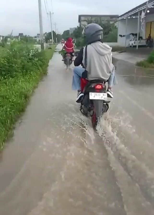 two motorcycles driving through a flooded street. The motorcycle in the foreground has two riders: the driver wears a grey hoodie and a dark helmet, and the passenger wears jeans and sneakers. The motorcycle in the background has a single rider wearing a red hijab. The street is covered in murky water, and the motorcycles create large splashes as they move. On either side of the street, there are patches of green grass and scattered buildings. Overhead, power lines stretch across the sky, adding to the scene of suburban flooding.