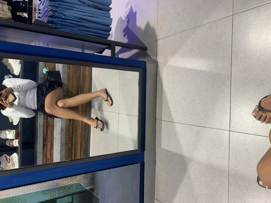 The image displays an indoor scene within a retail establishment in Kuta, Indonesia. The photographer's bare feet, adorned with black thong-style sandals featuring a knot design, are visible in the bottom right foreground. A large vertical mirror, framed in blue on the left and black on the right, occupies the central portion of the frame. This mirror reflects an individual, presumably the photographer, seated with legs crossed. The reflected person wears a white long-sleeved top with black lace detailing at the neckline and a black pleated mini-skirt. They are holding a dark-colored smartphone, obscuring their face, while capturing the image. Their reflected feet wear identical black thong-style sandals, with the left foot slightly elevated. Behind the reflected individual, a stepped display unit with a wooden texture showcases various athletic shoes, predominantly white and light-colored sneakers. A black handbag is positioned on this display next to the reflected person. To the right of the mirror, a clothing rack displays blue or teal-colored apparel, likely shorts or trousers. The floor is covered with large square light grey tiles with dark grout lines, illuminated by artificial lighting, which casts shadows across the surface.