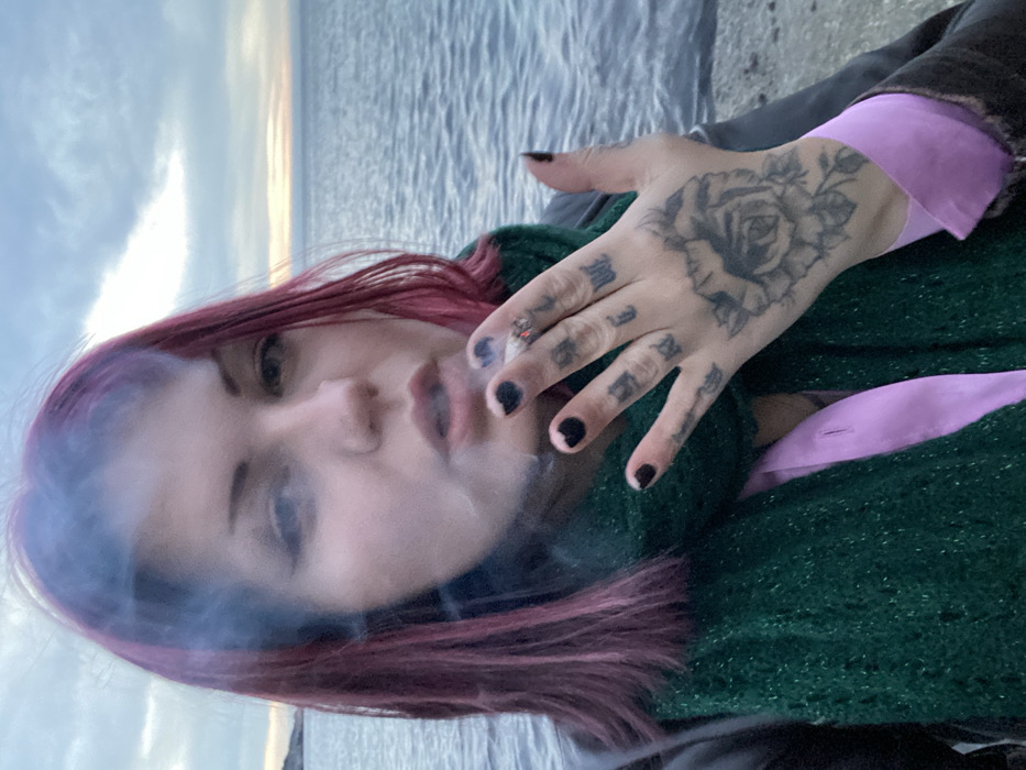A woman with dyed pink hair and numerous hand tattoos holds a lit cigarette. She wears dark nail polish and a green knit scarf over a lavender shirt. Smoke obscures part of her face as she looks at the camera. The background features a body of water and a cloudy sky at dusk.