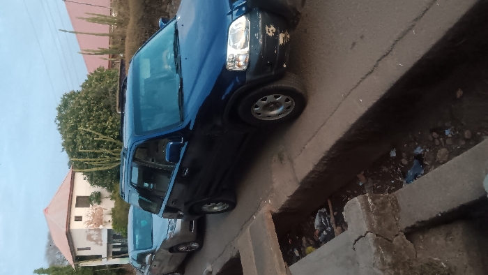 The image portrays an urban roadside scene in Jos, Nigeria, during either dawn or dusk, indicated by the soft, ambient light. In the immediate foreground, a concrete drainage ditch runs horizontally across the frame, containing various pieces of litter including plastic bags and general refuse. Adjacent to this ditch, two vehicles are parked on the side of a paved road. The primary vehicle in focus is a dark blue first-generation Honda CR-V SUV, oriented facing left, with its front bumper exhibiting peeling paint and minor surface damage. A faint silhouette of an individual is visible within the driver's seat. Behind this SUV, a silver or light grey sedan, identifiable as a Honda Accord, is partially visible, also parked parallel to the road. In the background, to the left, a two-story building with light-colored, weathered walls showing extensive peeling plaster and a reddish-brown hip roof is present. Further into the background, a large green tree and several tall, slender, cactus-like plants are visible, partially obscuring another building with a similar reddish-brown roof. The overall environment suggests a residential or commercial street with visible infrastructure and vegetation.