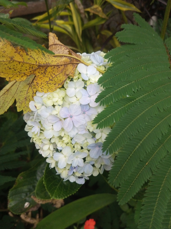 A close-up photograph displays a dense cluster of small, predominantly white to pale blue flowers, resembling a hydrangea inflorescence, positioned centrally within a natural outdoor setting. Some individual florets exhibit a faint yellowish-green hue, suggesting varying stages of bloom. A small, black ant is present on a lower white petal towards the bottom left of the flower cluster. To the upper left, a large, senescent leaf, characterized by its mottled yellow and brown coloration and dark speckles, partially overlays the flowers. On the right side of the frame, a segment of a large, dark green compound leaf with numerous small, symmetrical leaflets is prominently featured, partially obscuring the flower cluster. The background consists of blurred foliage, including sections of green leaves and what appears to be variegated yellow and green plant material. A small, vibrant red flower or bud is faintly visible at the very bottom center of the frame, partially out of focus. This scene is located in Ciherang, Indonesia.