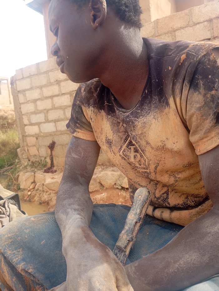 An individual, appearing to be an adult male with dark skin and short, dark hair, is depicted in a profile view, looking leftward, within an outdoor, semi-constructed or excavated environment in the city of Unknown, Unknown. He is heavily soiled with light brown dirt or mud on his face, arms, and clothing. He wears a dark t-shirt with a faint, dirt-obscured design on the chest, and dark blue pants. A utility or folding knife with a dark handle is visibly tucked into his waistband, resting on his right thigh. His left forearm, coated in a thick layer of light brown dirt, is prominent in the foreground. The background features a partially constructed or damaged light-colored brick/cinder block wall on the left, and a reddish-brown earthen landscape with rocks and a small pool of murky water towards the center and right. The scene suggests a setting involving manual labor, possibly construction or excavation.