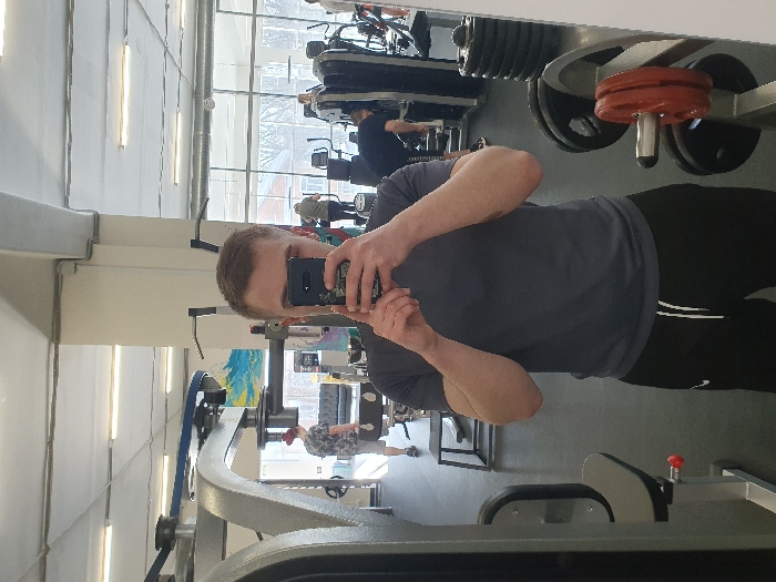 A male individual, approximately 20-30 years old, stands centered, taking a mirror selfie inside a fitness center