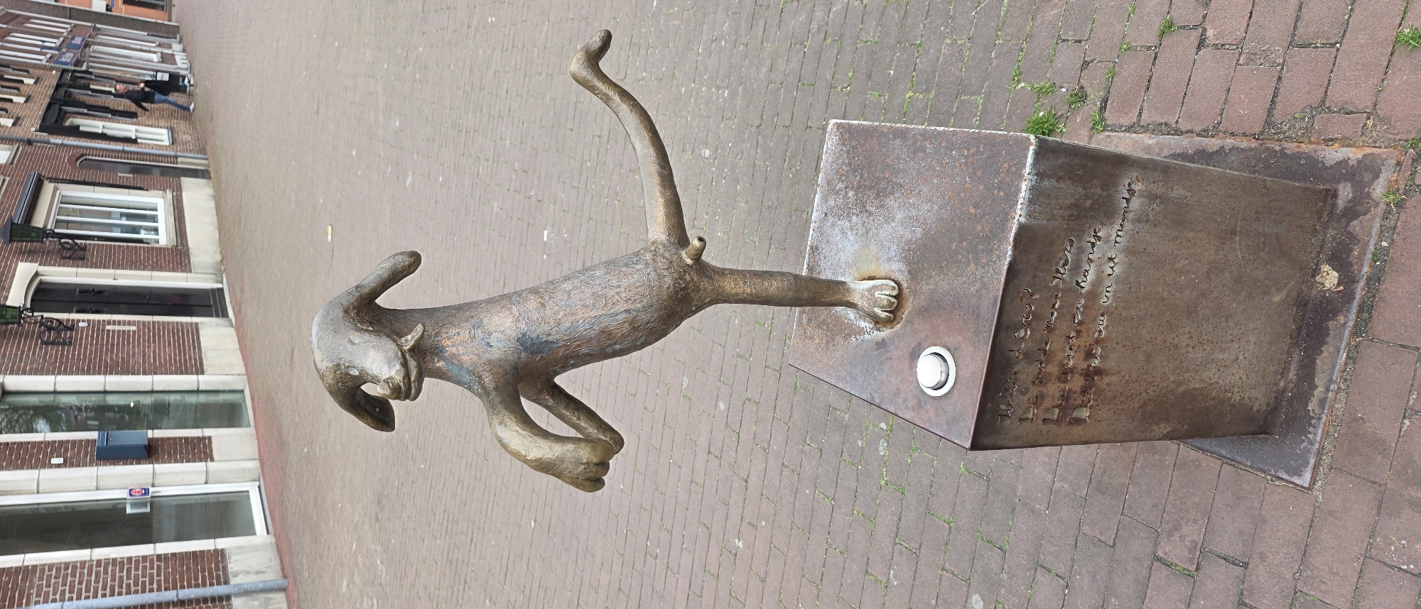 A bronze sculpture of a bipedal dog-like figure stands on a rusted metal cube pedestal on a brick-paved sidewalk in Horst, Netherlands. The sculpture, exhibiting a dark brown and greenish patina, is posed on its left leg with its right leg bent and extended backward, while its left paw is raised. A prominent penis is visible on the figure. The pedestal features engraved script on its front face and a silver-colored push-button on its top surface, to the left of the sculpture's left foot. The ground is paved with reddish-brown rectangular bricks, with minimal grass growth in the cracks. In the background, a row of multi-story brick buildings lines the street. The nearest building displays a brown brick facade with white-framed glass doors, a blue wall-mounted mailbox, and white-framed windows. Further down the street, additional brick buildings with various windows and dark doors are visible. Two dark-colored, ornate streetlights are mounted on the building facades. A single individual, dressed in a dark jacket and light pants, is observed walking on the sidewalk in the distant background.
