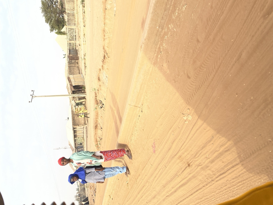 Two women stand on a sandy road in a sunny, rural environment. One wears a blue head covering, a striped shirt, and blue jeans. The other has on a red head covering, a light green shirt, and patterned red pants. Behind them is a scene of weathered buildings, fences, and power lines. Tire tracks are prominent in the sandy ground. The image has been rotated to the side.