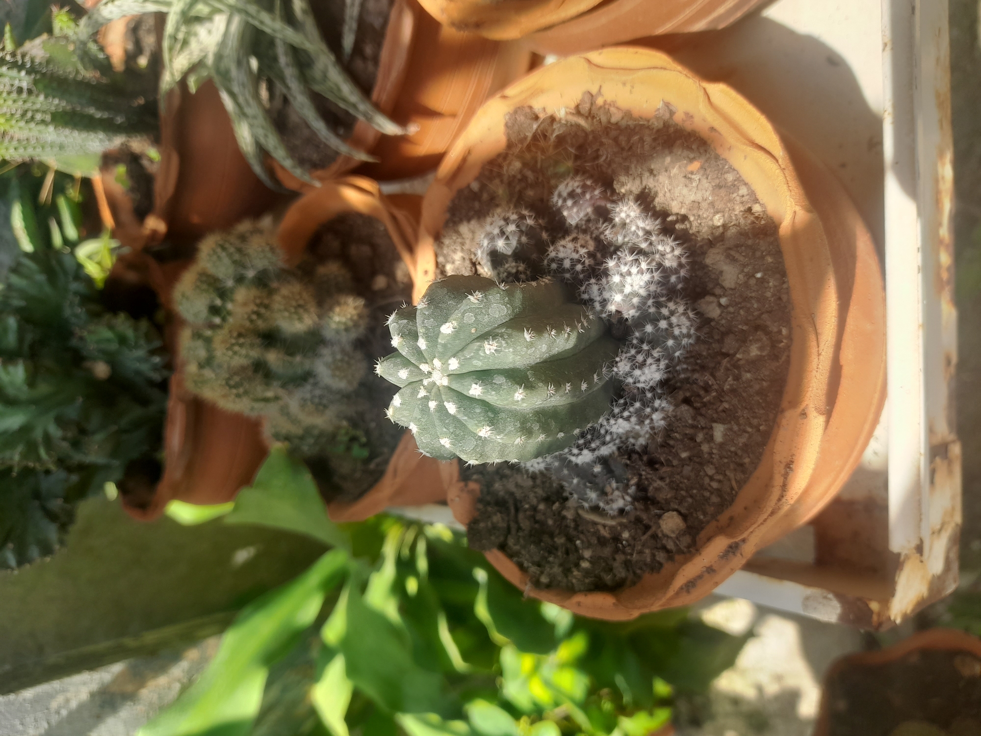 A high-angle, close-up shot shows a collection of potted plants, likely succulents and cacti. The main subject is a round, green cactus with white spines, planted in a terracotta pot. The soil in the pot appears to have a white powdery substance on the surface, potentially mold or mineral buildup. Other terracotta pots containing various types of succulents are also visible in the background. Below the pots, bright green leaves are seen. The plants are sitting on a white windowsill, partially rusted. The scene is set outdoors, under bright sunlight. The location is Tinaquillo, Venezuela.