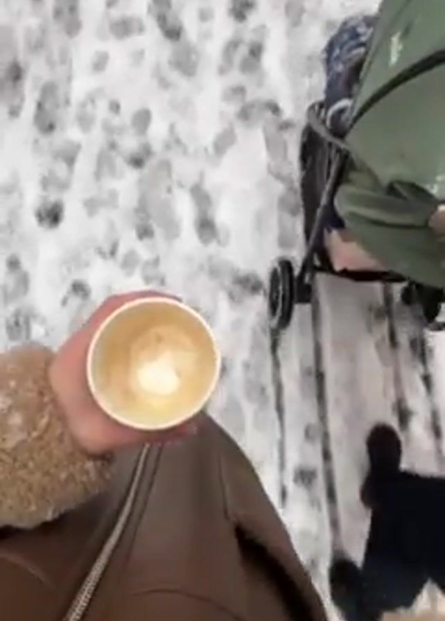 first-person perspective of someone walking in the snow while holding a paper cup of coffee. A stroller with a child is in front of them. The person is wearing a brown coat. The ground is covered in snow with footprints visible. The stroller has a green cover.