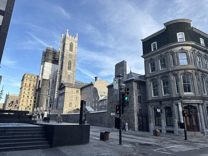 A cityscape shows a corner building with grey stone facade and a dark green mansard roof. Next to it is a stone building with a single window and a traffic light showing green. In the background, a tall stone church tower partially covered in scaffolding dominates the view. Bare trees and a blue sky with thin clouds can be seen above the buildings. The foreground shows a grey intersection with stairs on the left and trash cans on the right.