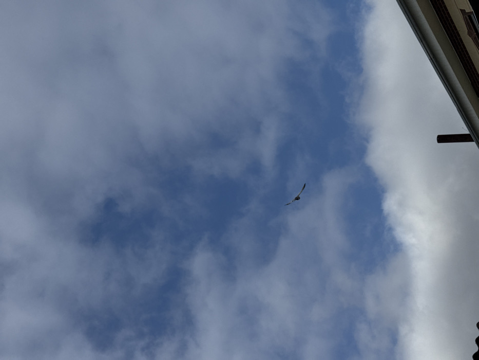 A daytime shot shows a partly cloudy sky with patches of blue. A single bird with outstretched wings is flying in the center of the frame. In the upper right corner, a section of a building is visible, featuring a dark horizontal beam protruding from the side. The building itself appears to be light-colored.