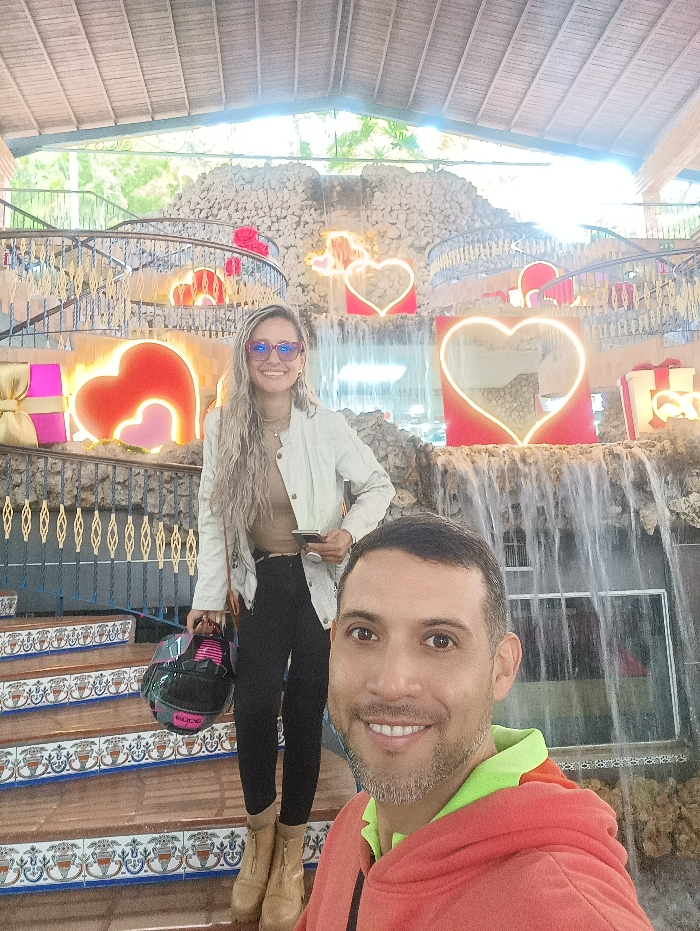 A selfie-style photograph captures two individuals in a decorated indoor or semi-covered environment in Carrizal, Venezuela