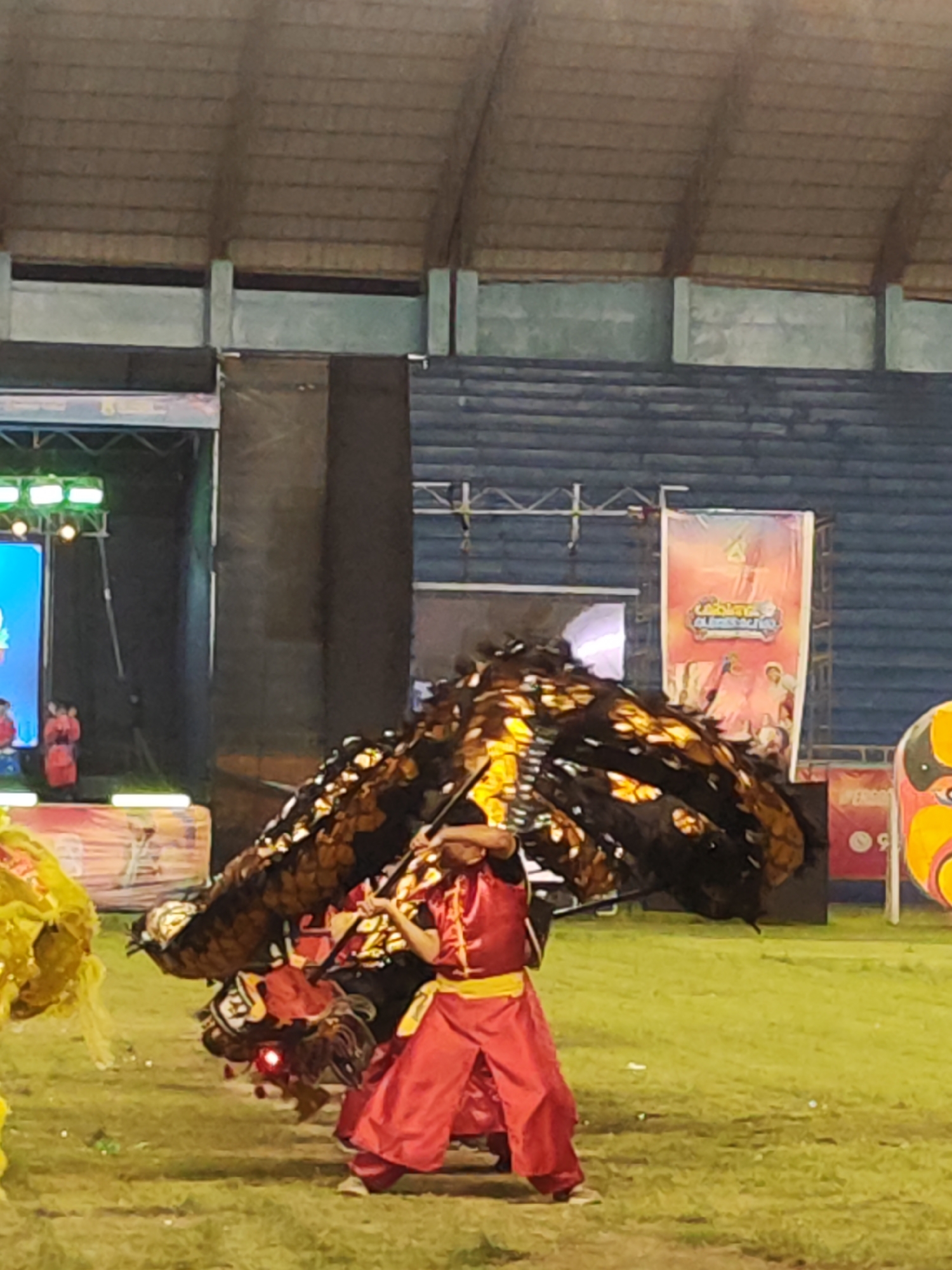 The image depicts a nighttime cultural performance on a grassy field within a covered stadium or arena, located in Coronel Gregorio Albarracín Lanchipa, Peru. In the central foreground, a performer dressed in a red traditional costume with yellow trim holds a long dark pole, maneuvering a large dragon costume. The dragon costume is primarily dark brown or black with prominent golden or bronze scale-like patterns. Its head, positioned low, exhibits glowing red eyes. To the immediate left, a portion of a bright yellow, fluffy costume is visible. In the left midground, a brightly lit stage is present, featuring a large LED screen displaying blue content. Two individuals in red costumes stand on the stage, observing the performance. Green lights illuminate the stage structure. In the right midground, a tall, vertical banner with colorful graphics, including a prominent "4" symbol and text partially decipherable as "Celebración," is displayed. Adjacent to it, a large, rounded object with yellow and red patterns is visible. The background consists of dark, tiered stadium seating (bleachers) under a high, light-colored, possibly wooden or corrugated, vaulted ceiling structure supported by concrete beams. The ground is an uneven grassy surface with scattered white debris. Artificial event lighting illuminates the scene.