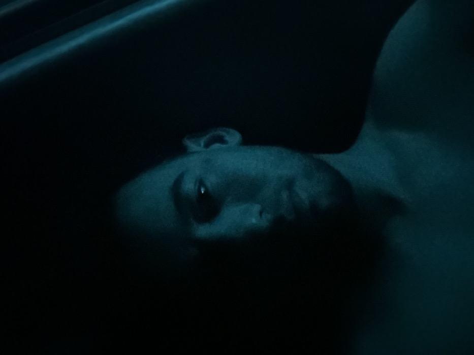 A person lies in murky water, their face partially illuminated