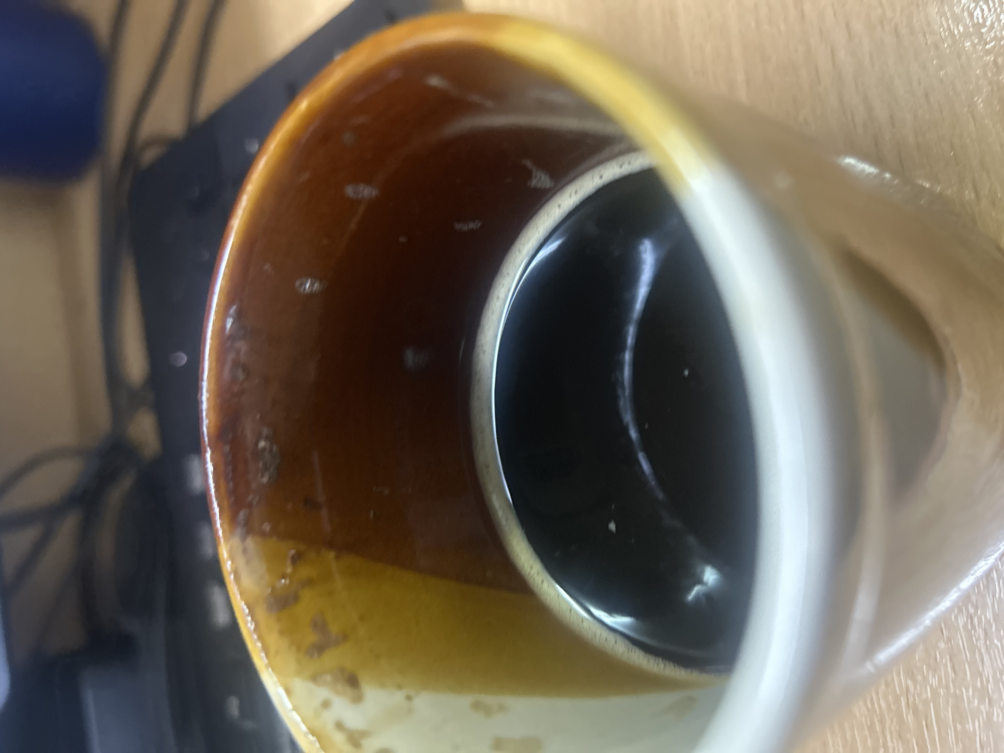 A close-up, angled shot shows the interior of a ceramic mug filled with a dark liquid, likely coffee or tea. The mug is light brown and tan on the exterior, with a darker brown glazed interior. The liquid has a few bubbles around the rim. The mug appears to be sitting on a light-colored, possibly wooden, surface. To the left of the mug is part of a black object, possibly a keyboard or another electronic device, along with some wires. The focus is sharpest on the inside of the mug, with the background slightly blurred. There are no identifiable people or indications of the city of Guayaquil, Ecuador, in the image.