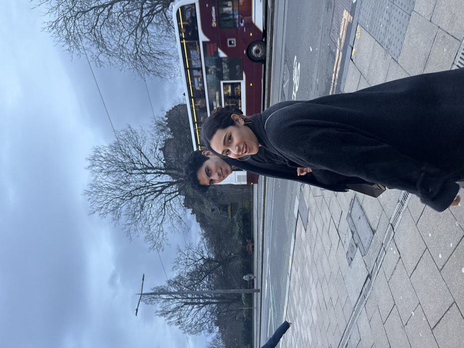 Two people, one man and one woman, stand on a paved sidewalk. The woman smiles toward the camera, while the man is slightly behind her to her left. They both wear dark jackets. In the background, a red double-decker bus is next to a road. Behind that, a bare tree stands in front of a rocky cliff. The sky is gray and overcast.
