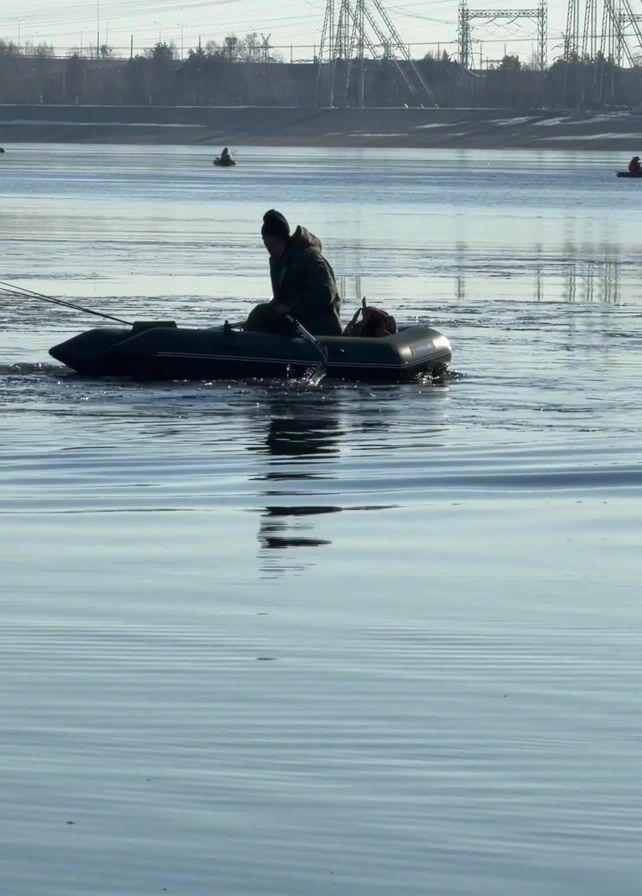 The scene is an outdoor shot on a sunny day, focusing on a body of water with several people in boats. One individual in a dark coat and hat is in the center of the frame in a small inflatable boat, using oars to navigate the water. In the background, there are other boats with solitary occupants. The opposite bank of the water features an industrial landscape with power lines and structures visible against the clear sky. The water is rippled and reflects the light, with some scattered ice floes. The camera zooms out slightly to reveal a larger ice floe floating in the water closer to the camera. A fishing rod is barely visible near the bottom left corner of the frame.