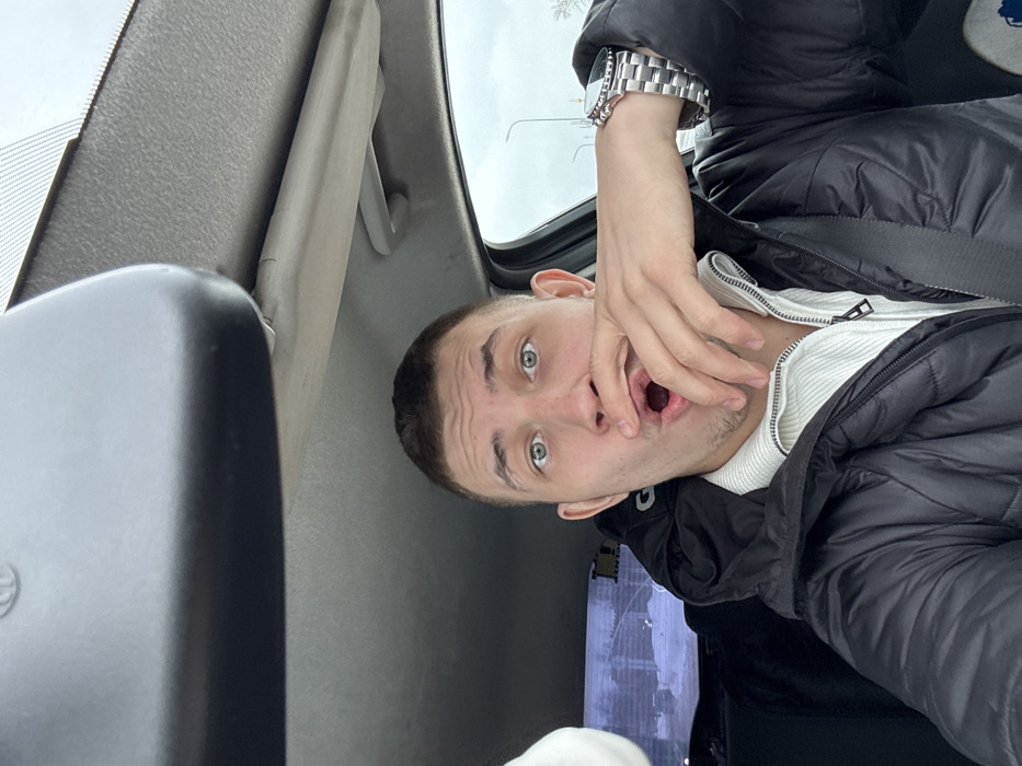 A male individual is depicted from the chest up, seated inside the front cabin of a vehicle. The subject, with short, dark hair and light-colored eyes, is wearing a white, ribbed zip-neck top under a black puffer jacket. A silver-toned wristwatch with a metal band is present on his left wrist. His mouth is open in an "O" shape, and his left hand is positioned horizontally in front of his mouth, partially obscuring it. His eyes are wide, and his eyebrows are slightly raised, directed towards the camera. The interior of the vehicle shows a rearview mirror at the top-center, along with a light-colored headliner and a sun visor. The exterior environment, visible through the windows, includes an overcast grey sky and background elements consistent with an urban area in a cold climate, with visible snow in the distance through the rear of the vehicle. This scene takes place in the city of Chaikovsky, Russia.