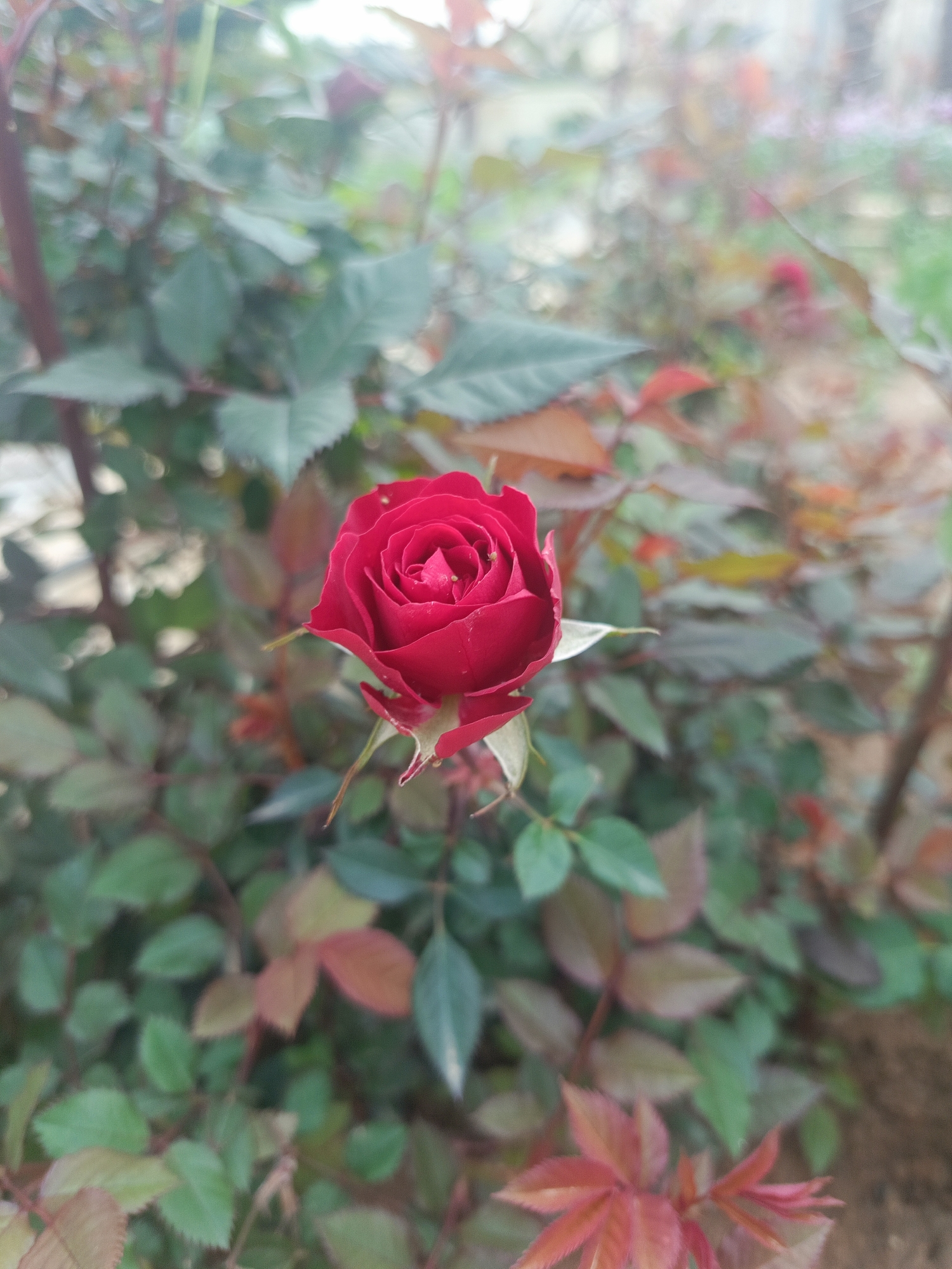 A single, deep red rosebud is prominently centered in a close-up, vertically oriented image depicting an outdoor garden scene in Mosul, Iraq. The rosebud, approximately 5 cm in diameter, exhibits numerous tightly furled crimson petals and green sepals at its base. It is surrounded by blurred rose foliage, characterized by various shades of green and reddish-brown leaves and stems, creating a shallow depth of field. No individuals, animals, or observable actions are present within the frame. The scene is illuminated by natural, diffused daylight.