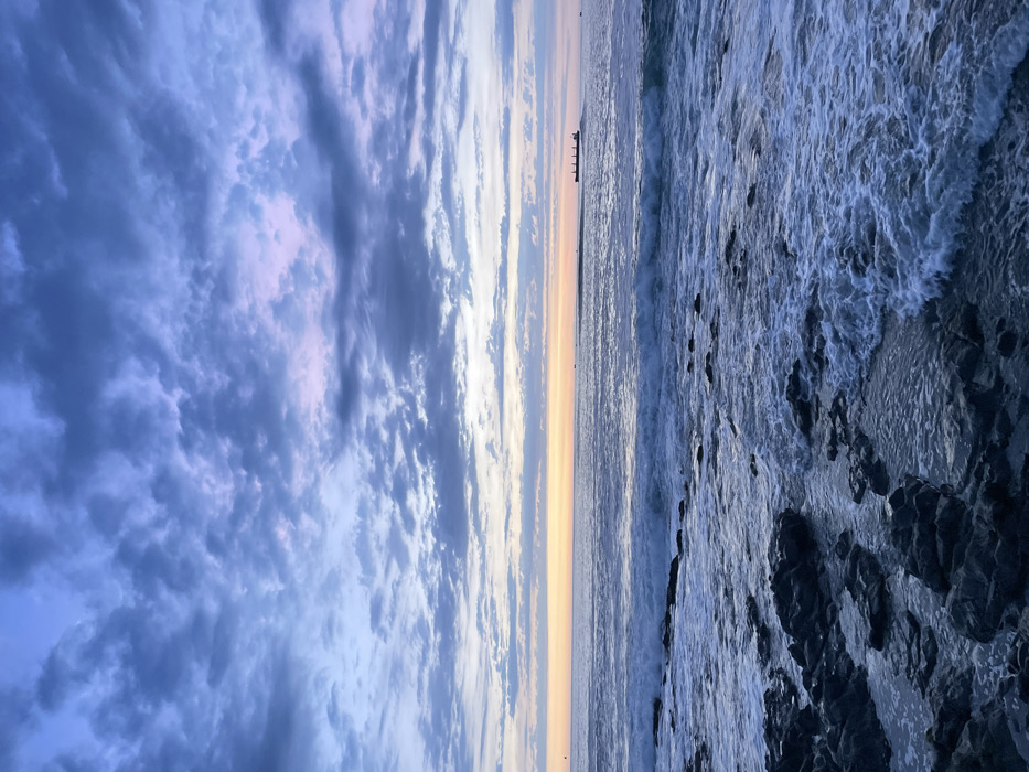 A beach scene captured at dusk. Dark rocks and crashing waves occupy the right side. A thin strip of horizon glows with fading sunlight. To the left, a dramatic sky full of textured clouds is cast in shades of blue and purple. A pier or structure is visible in the distant ocean.