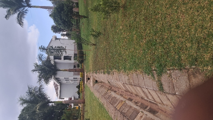 The scene depicts an outdoor landscaped area, likely a park or institutional grounds, under a partly cloudy sky. A dark, blurry object, consistent with a human digit, partially obstructs the lower-left corner of the image. A concrete drainage ditch, approximately 1.5 meters wide, with angled block sides and a flat bottom, extends from the lower left to the mid-ground, appearing dry. Two smaller concrete culvert sections are visible crossing the ditch in the mid-ground. To the right of the ditch, a manicured lawn with green grass, exhibiting some patches of dry or sparse grass, covers the ground. Scattered throughout the lawn are several small shrubs and young trees. In the mid-ground, two mature palm trees with slender, brown trunks rise prominently to the left of the drainage ditch. In the background, a light-colored, multi-story building, possibly white or light gray, with a brown-tiled gabled roof is visible. The building features multiple rectangular window openings that appear dark. Additional mature trees and dense foliage are present around and behind the building. No individuals or overt actions are depicted. The specific location within Nairobi, Kenya, is not discernible from the visual information provided.