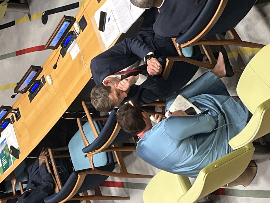 The image displays a section of a formal conference room, identifiable by its distinctive furniture and carpet pattern as the United Nations Headquarters in New York City, United States