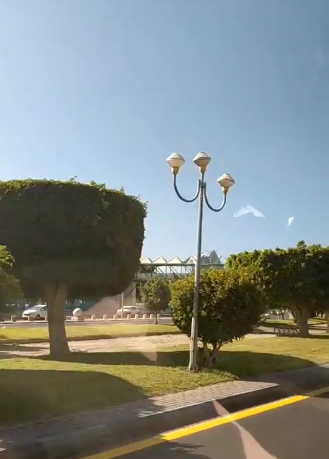 car moving along a road. On the side of the road, there is a sidewalk and grass with green, box-shaped trees. In the distance, a pedestrian bridge is visible. The sky is blue.