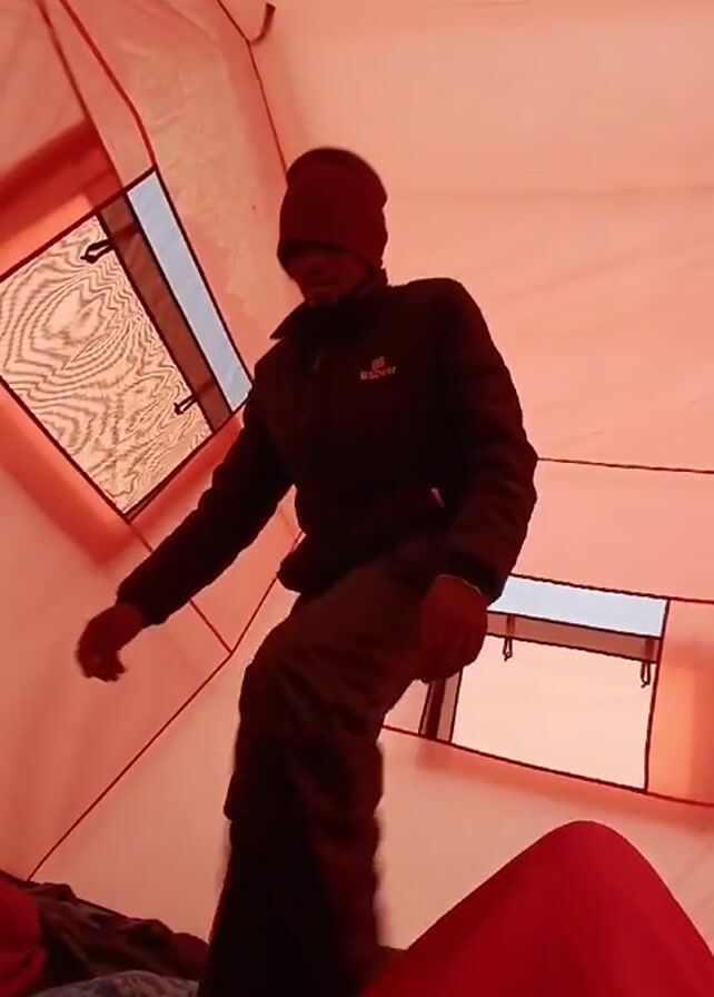 Inside a tent with red-tinted light, a person wearing a dark jacket, pants, and a dark beanie stands and looks down. The tent has several small, rectangular windows. The person picks up a blue and gray camouflage-patterned blanket. The tent poles are visible. There is a red sleeping bag at the bottom of the frame. The person seems to be tidying up or packing items in the tent.