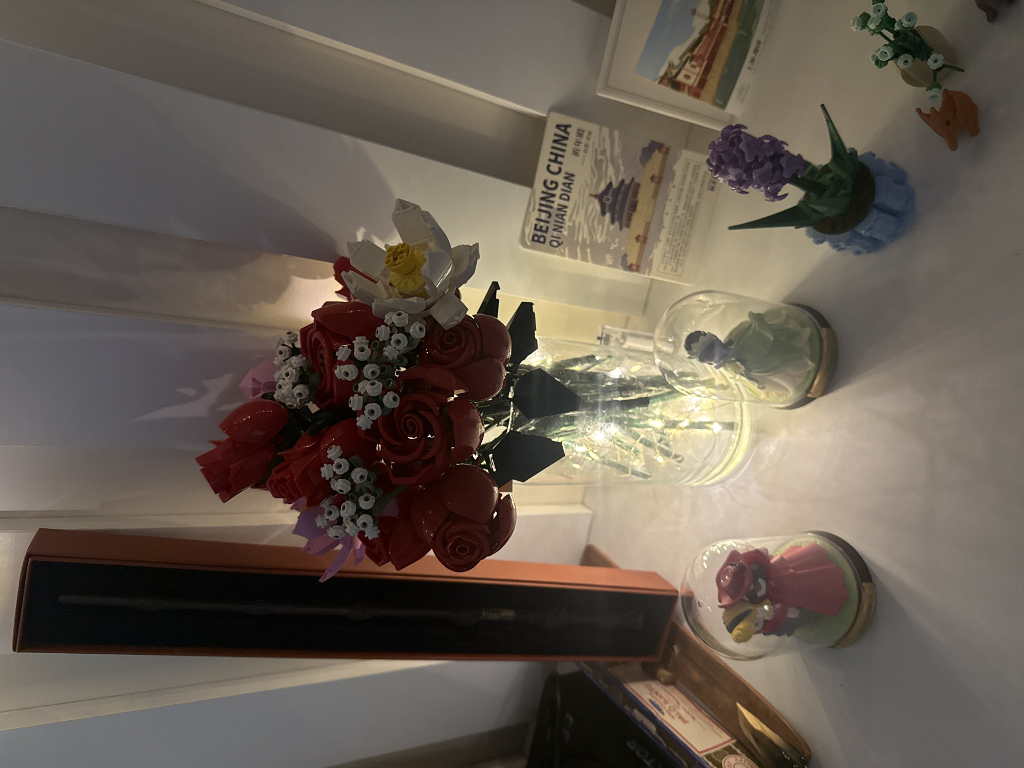 A close-up shot depicts a shelf cluttered with various items. Prominently featured are Lego floral arrangements including red roses with baby's breath, and a white lotus-like flower. A wand in a brown box rests partially beneath the Lego bouquet. Behind the flowers, a clear vase containing lights is visible, next to two bell jars encasing figurines. A framed picture of Beijing China is also on the shelf. The location in the city of Batumi, Georgia is not mentioned in the image.