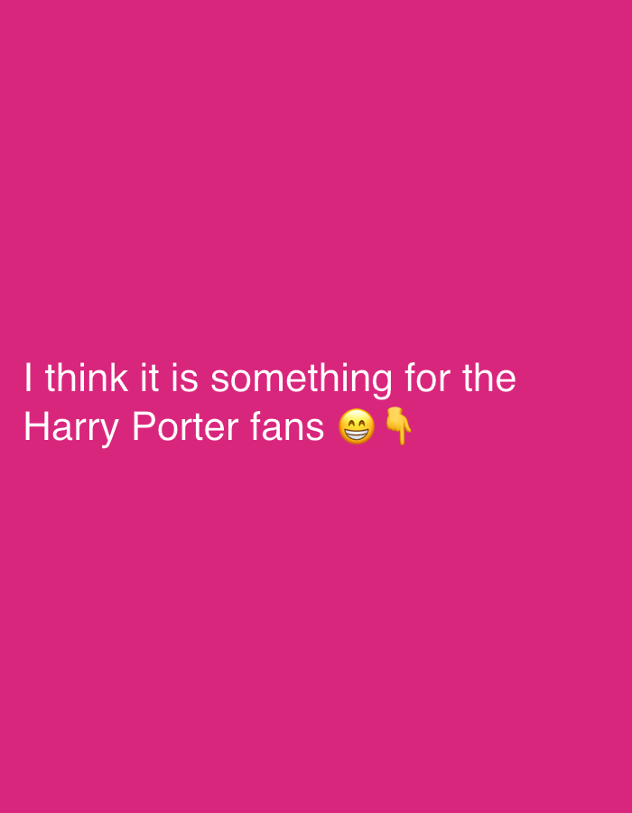 The image displays a digital graphic with a uniform magenta background. White text is positioned in the lower central area, reading: "I think it is something for the Harry Potter fans". This phrase is immediately followed by a grinning face emoji (😁) and a downward-pointing backhand index finger emoji (👇). The visual content consists solely of this text and background; there are no depicted people, physical objects, specific actions, or natural environment. The textual content directly references a subject of interest for Harry Potter fans, commonly associated with academic and historic sites in Oxford, United Kingdom, such as Christ Church College or the Bodleian Library, which served as filming locations or inspirations for the series.